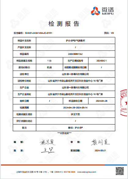 护小侠空气消毒杯检测报告